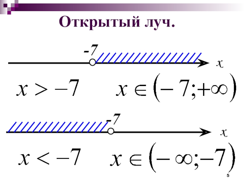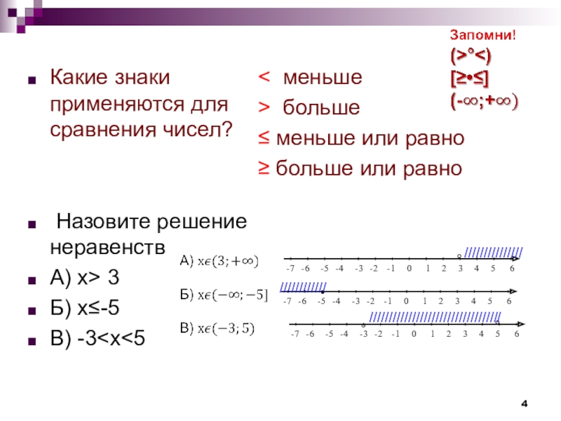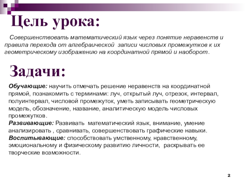 Обучающие: научить отмечать решение неравенств на координатной прямой, познакомить с терминами: луч, открытый луч, отрезок, интервал, полуинтервал, числовой промежуток, уметь записывать геометрическую модель, обозначение, название, аналитическую модель числовых промежутков.