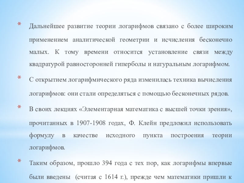 Слайд 12Дальнейшее развитие теории логарифмов связано с более широким применением аналитической геометрии