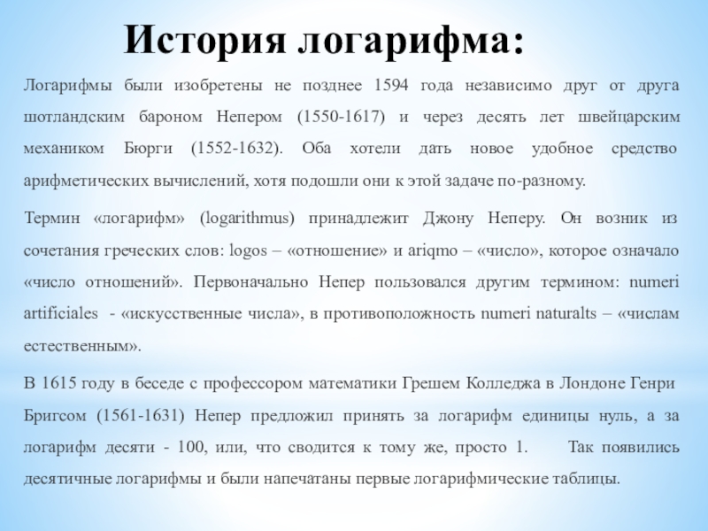 Термин «логарифм» (logarithmus) принадлежит Джону Неперу. Он возник из сочетания греческих слов: logos – «отношение» и ariqmo – «число», которое означало «число отношений». Первоначально Непер пользовался другим термином: numeri artificiales - «искусственные числа», в противоположность numeri naturalts – «числам естественным».