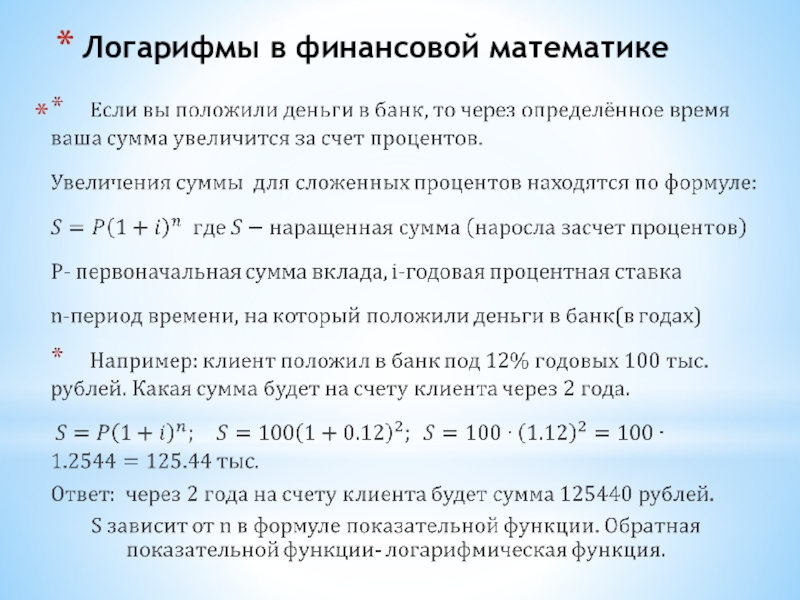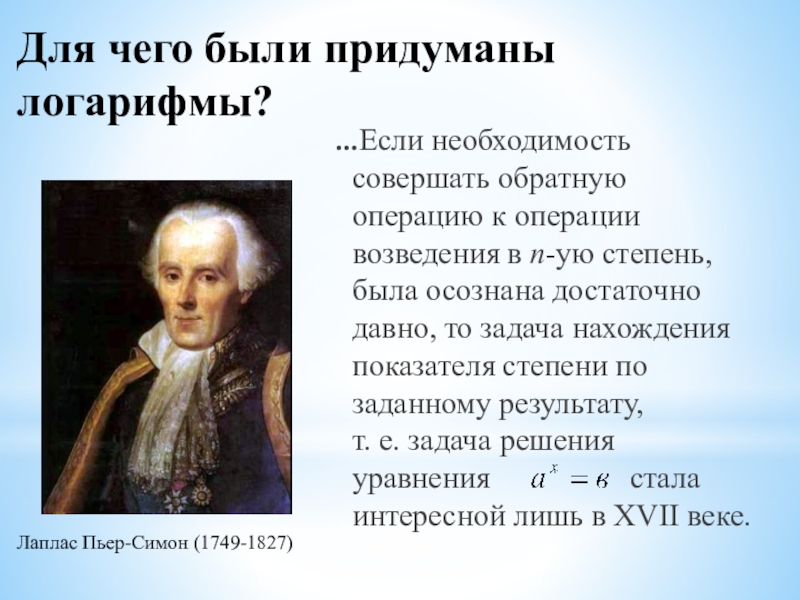 возведения в n-ую степень, была осознана достаточно давно, то задача нахождения показателя степени по заданному результату, т. е. задача решения уравнения стала интересной лишь в XVII веке.