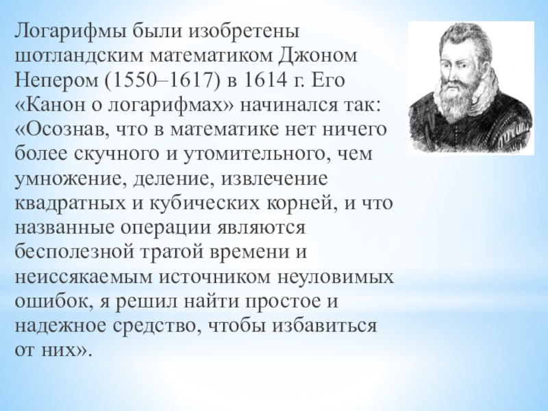 Слайд 7Логарифмы были изобретены шотландским математиком Джоном Непером (1550–1617) в 1614 г.