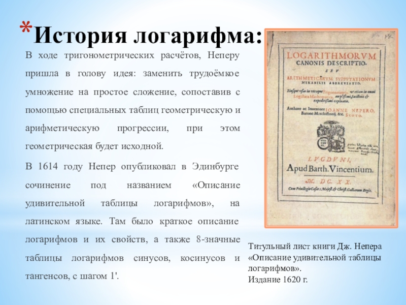 В 1614 году Непер опубликовал в Эдинбурге сочинение под названием «Описание удивительной таблицы логарифмов», на латинском языке. Там было краткое описание логарифмов и их свойств, а также 8-значные таблицы логарифмов синусов, косинусов и тангенсов, с шагом 1'.