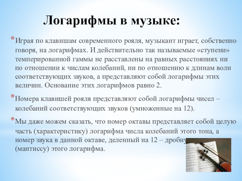 Выяснила, что, играя по клавишам современного рояля, музыкант играет, собственно говоря, на логарифмах.