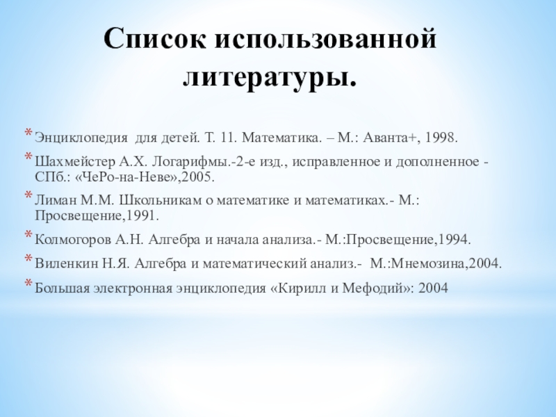 Шахмейстер А.Х. Логарифмы.-2-е изд., исправленное и дополненное - СПб.: «ЧеРо-на-Неве»,2005.