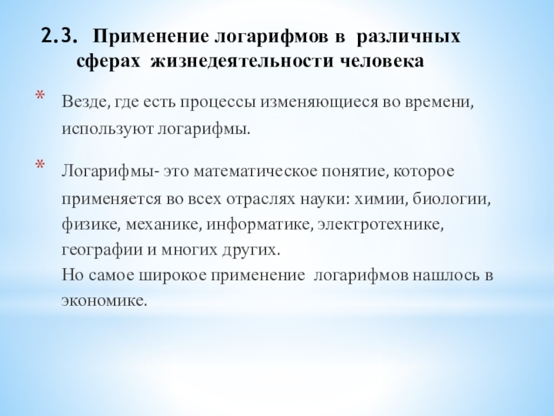 Логарифмы- это математическое понятие, которое применяется во всех отраслях науки: химии, биологии, физике, механике, информатике, электротехнике, географии и многих других. Но самое широкое применение логарифмов нашлось в экономике.