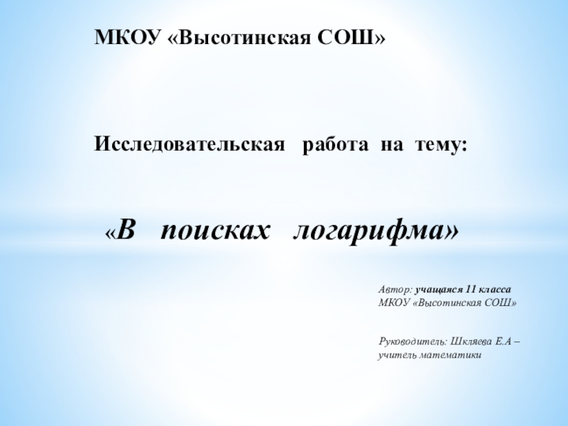 Материалы исследования имеют практическую значимость и могут быть использованы для дальнейшего изучения данной, столь увлекательной на мой взгляд, темы «В поисках логарифма».
