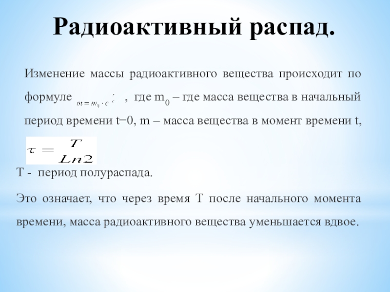 Это означает, что через время Т после начального момента времени, масса радиоактивного вещества уменьшается вдвое.