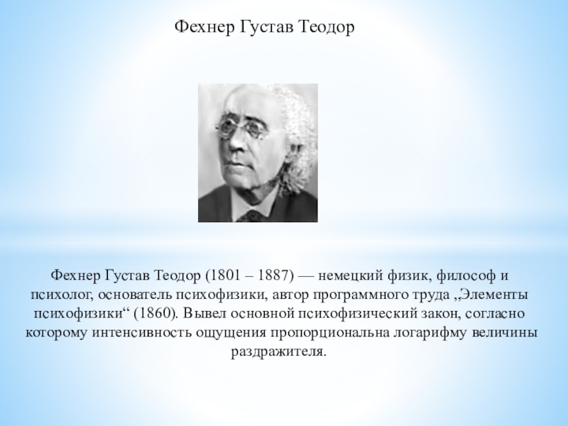 психолог, основатель психофизики, автор программного труда „Элементы психофизики“ (1860). Вывел основной психофизический закон, согласно которому интенсивность ощущения пропорциональна логарифму величины раздражителя.