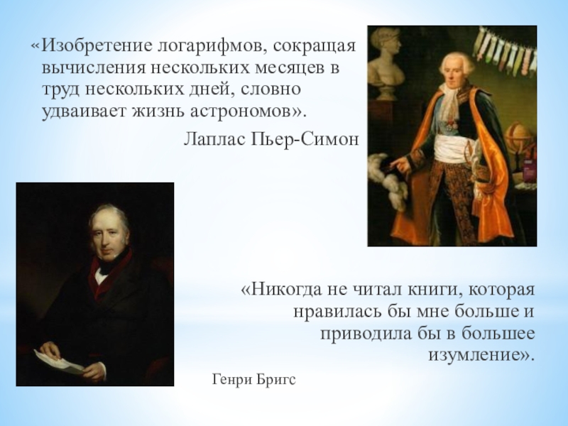 Слайд 6«Изобретение логарифмов, сокращая вычисления нескольких месяцев в труд нескольких дней, словно