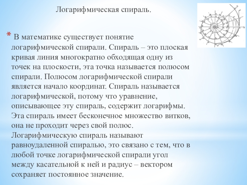 – это плоская кривая линия многократно обходящая одну из точек на плоскости, эта точка называется полюсом спирали. Полюсом логарифмической спирали является начало координат. Спираль называется логарифмической, потому что уравнение, описывающее эту спираль, содержит логарифмы. Эта спираль имеет бесконечное множество витков, она не проходит через свой полюс. Логарифмическую спираль называют равноудаленной спиралью, это связано с тем, что в любой точке логарифмической спирали угол между касательной к ней и радиус – вектором сохраняет постоянное значение.
