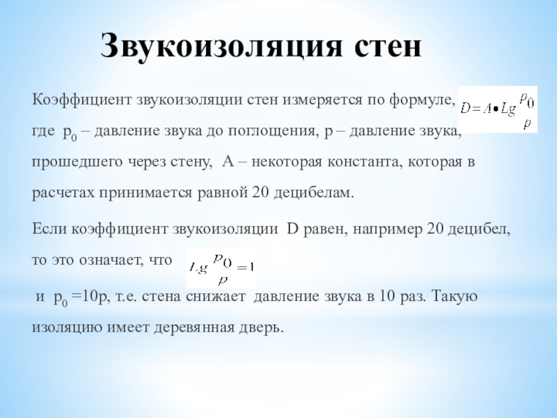 и p0 =10p, т.е. стена снижает давление звука в 10 раз. Такую изоляцию имеет деревянная дверь.