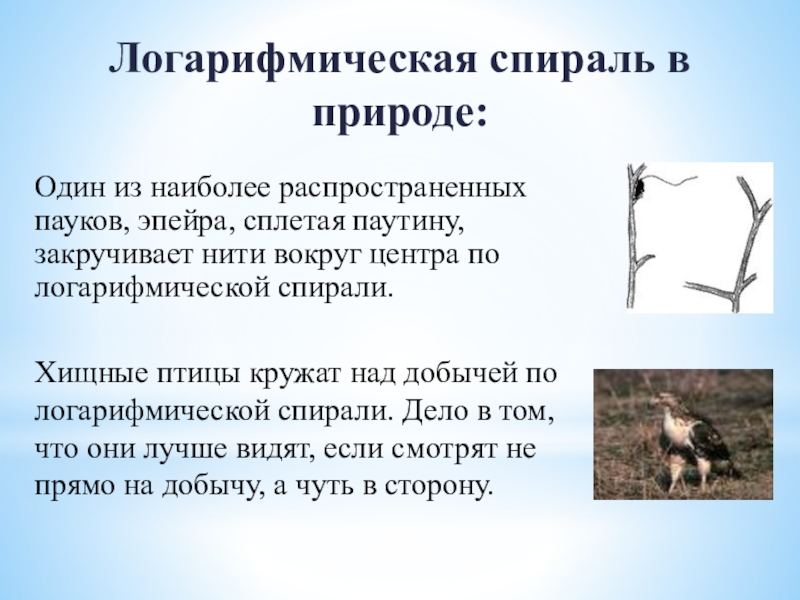 Один из наиболее распространенных пауков, эпейра, сплетая паутину, закручивает нити вокруг центра по логарифмической спирали.