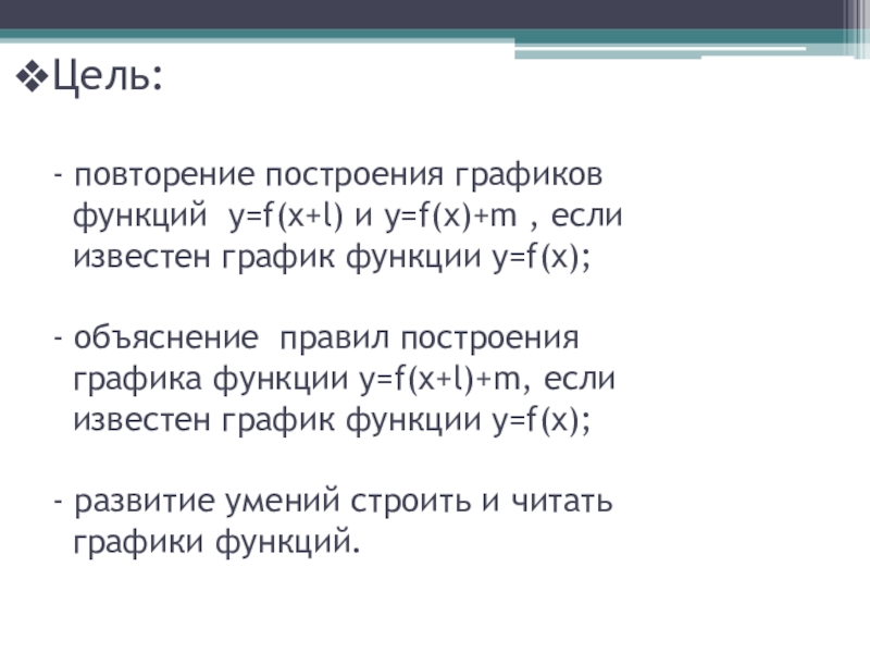 Слайд 2Цель: - повторение построения графиков функций y=f(x+l) и y=f(x)+m , если известен