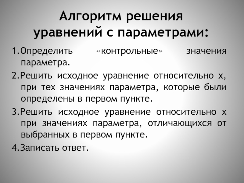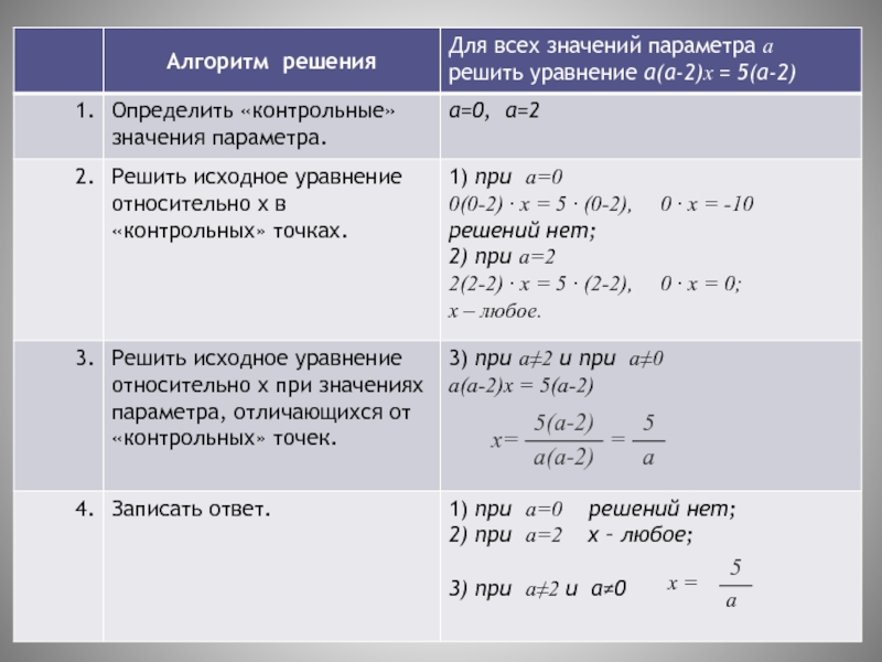 3.Решить исходное уравнение относительно х при значениях параметра, отличающихся от выбранных в первом пункте.