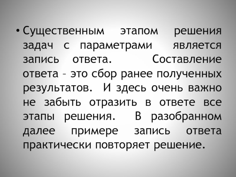 Слайд 7Существенным этапом решения задач с параметрами является запись ответа. Составление