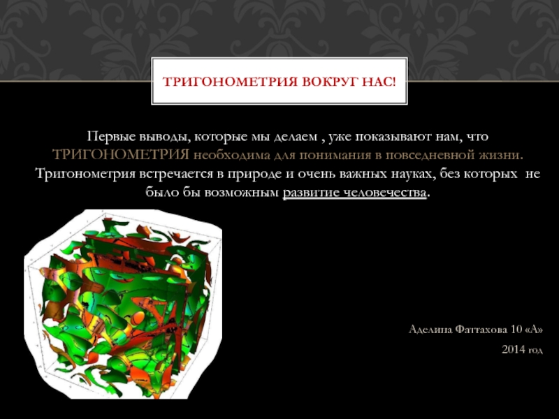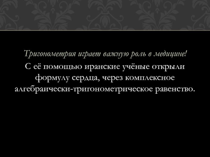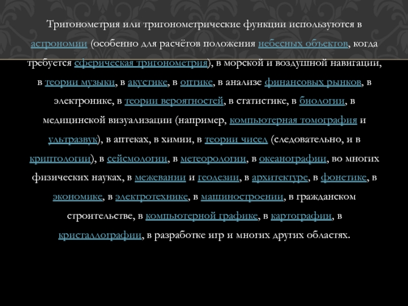небесных объектов, когда требуется сферическая тригонометрия), в морской и воздушной навигации, в теории музыки, в акустике, в оптике, в анализе финансовых рынков, в электронике, в теории вероятностей, в статистике, в биологии, в медицинской визуализации (например, компьютерная томография и ультразвук), в аптеках, в химии, в теории чисел (следовательно, и в криптологии), в сейсмологии, в метеорологии, в океанографии, во многих физических науках, в межевании и геодезии, в архитектуре, в фонетике, в экономике, в электротехнике, в машиностроении, в гражданском строительстве, в компьютерной графике, в картографии, в кристаллографии, в разработке игр и многих других областях.
