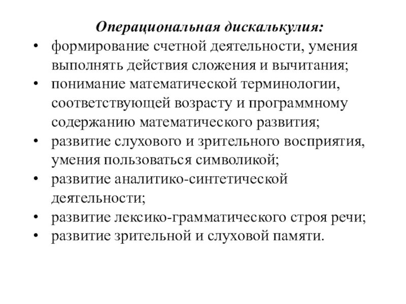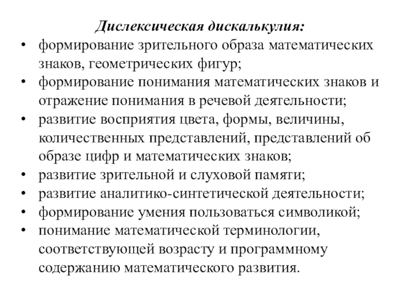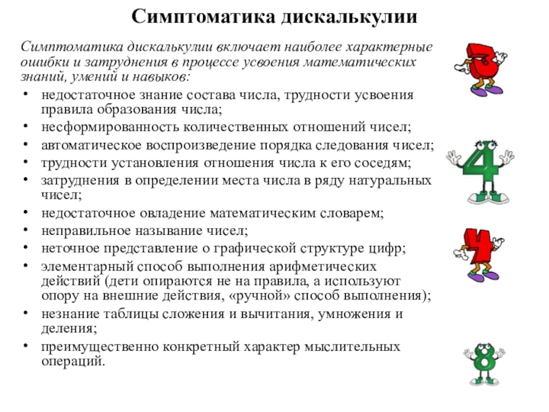 Симптоматика дискалькулии включает наиболее характерные ошибки и затруднения в