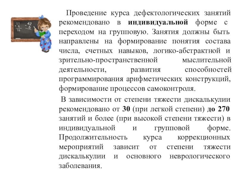 Слайд 15 Проведение курса дефектологических занятий рекомендовано в индивидуальной форме с