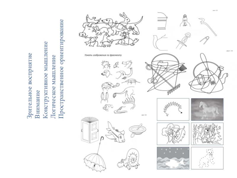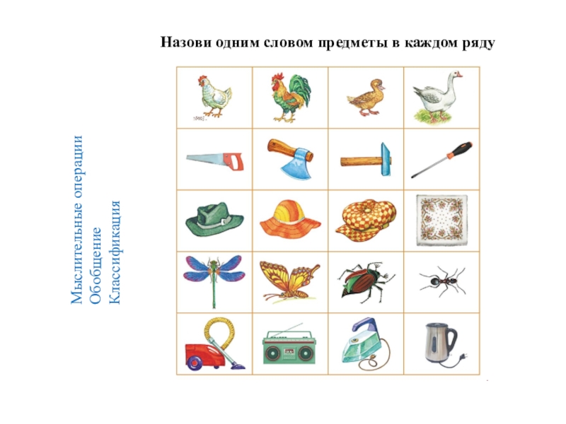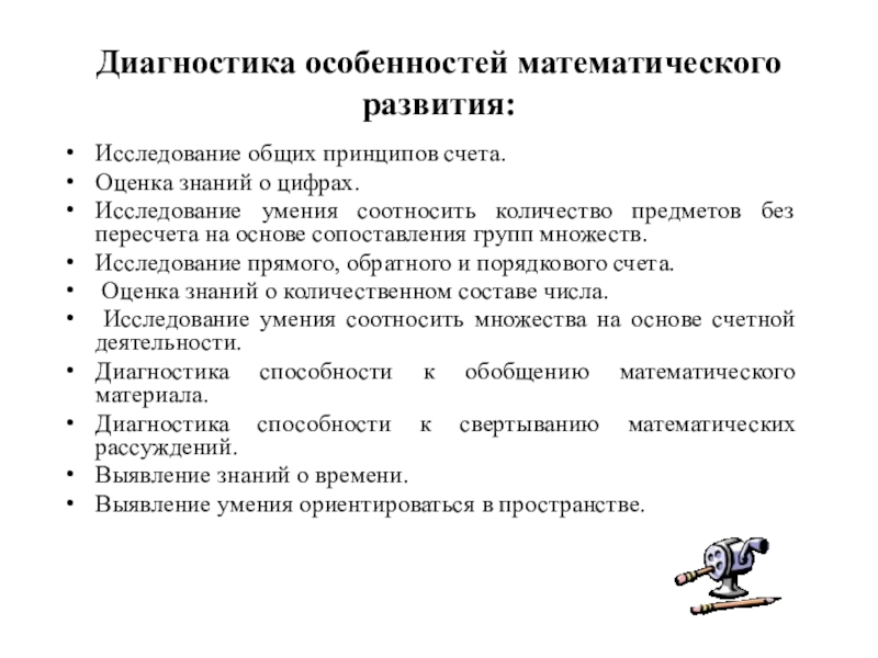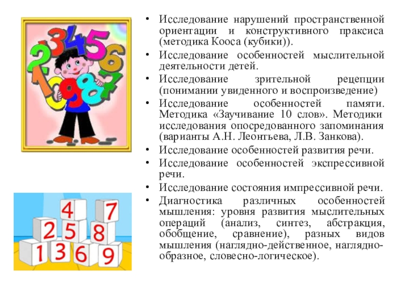 Диагностика различных особенностей мышления: уровня развития мыслительных операций (анализ, синтез, абстракция, обобщение, сравнение), разных видов мышления (наглядно-действенное, наглядно-образное, словесно-логическое).