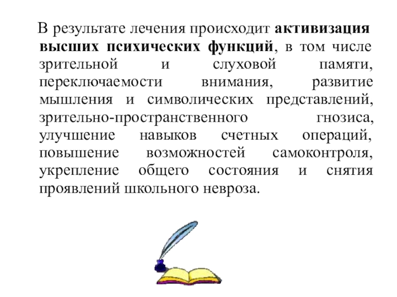 Слайд 14 В результате лечения происходит активизация высших психических функций, в