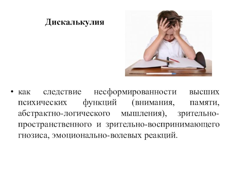 как следствие несформированности высших психических функций (внимания, памяти, абстрактно-логического мышления), зрительно-пространственного
