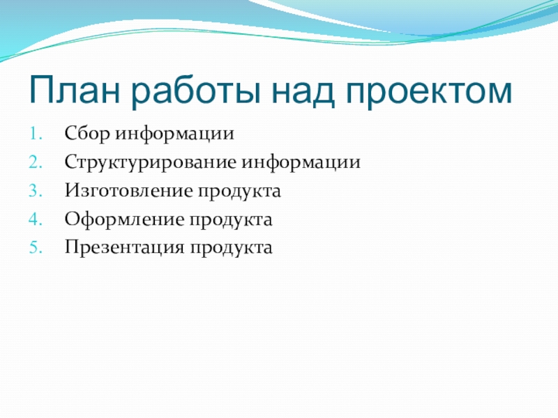 План работы над проектомСбор информацииСтруктурирование информацииИзготовление продуктаОформление продуктаПрезентация продукта