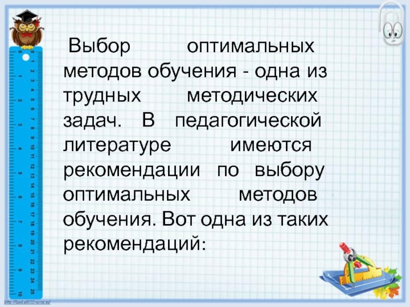 Слайд 11 Выбор оптимальных методов обучения - одна из трудных методических задач. В