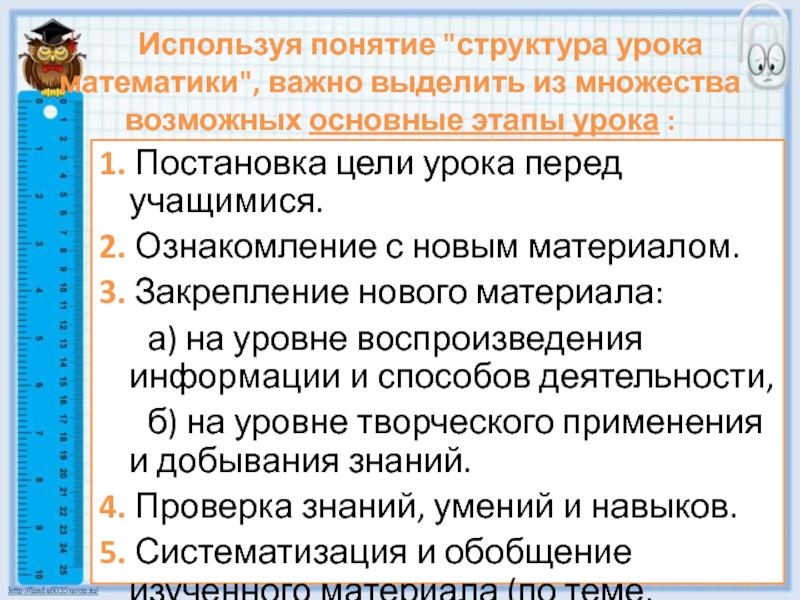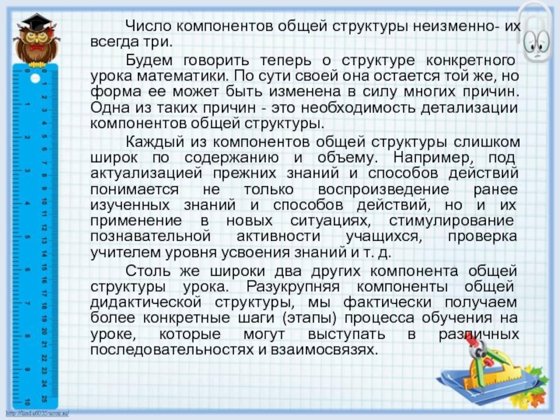 о структуре конкретного урока математики. По сути своей она остается той же, но форма ее может быть изменена в силу многих причин. Одна из таких причин - это необходимость детализации компонентов общей структуры.