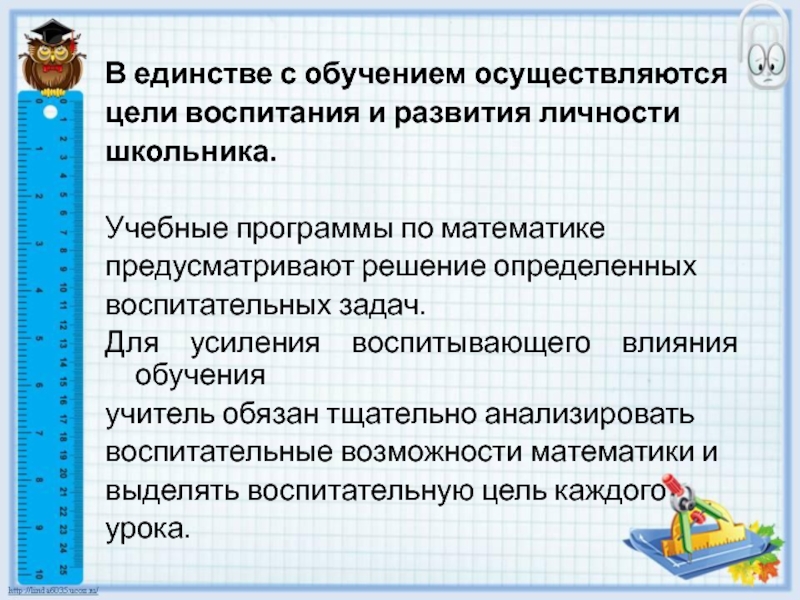 Целенаправленно и планомерно должно осуществляться не только обучение математике, но и воспитание на уроках математики.
