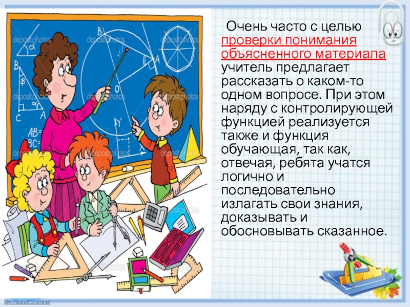 Слайд 29 Очень часто с целью проверки понимания объясненного материала учитель предлагает рассказать