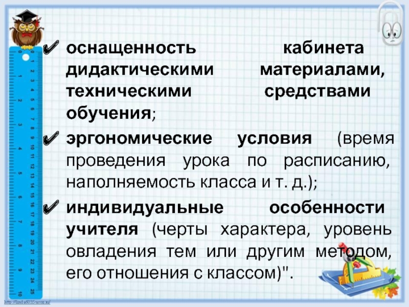 индивидуальные особенности учителя (черты характера, уровень овладения тем или другим методом, его отношения с классом)".