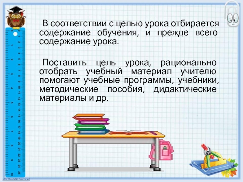 Слайд 9 В соответствии с целью урока отбирается содержание обучения, и прежде всего