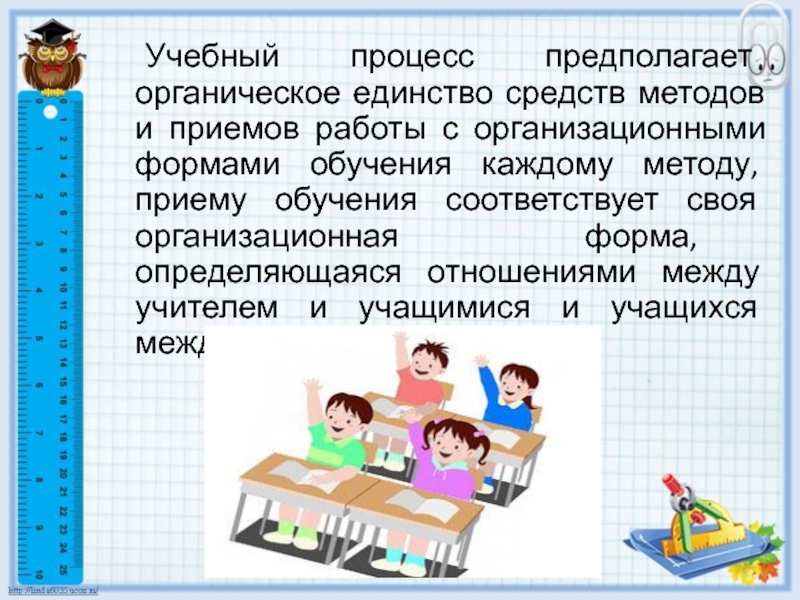 организационными формами обучения каждому методу, приему обучения соответствует своя организационная форма, определяющаяся отношениями между учителем и учащимися и учащихся между собой.