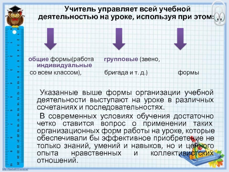 Указанные выше формы организации учебной деятельности выступают на уроке в различных сочетаниях и последовательностях.