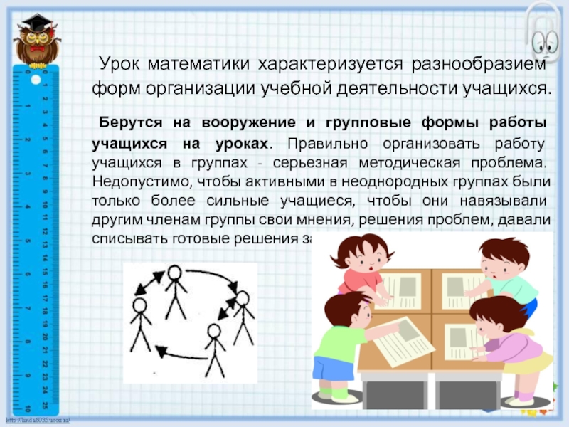 Слайд 26 Урок математики характеризуется разнообразием форм организации учебной деятельности учащихся.