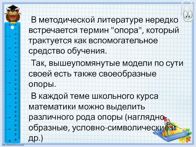 Слайд 24 В методической литературе нередко встречается термин "опора", который трактуется как вспомогательное