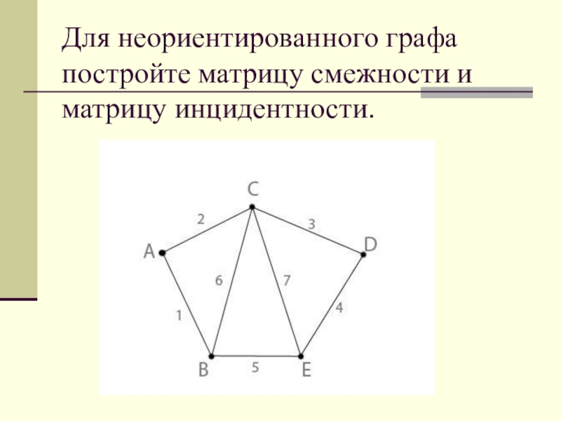 Слайд 5Для неориентированного графа постройте матрицу смежности и матрицу инцидентности.