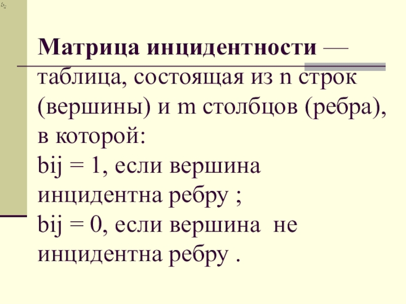 Матрица инцидентности — таблица, состоящая из n строк (вершины) и m столбцов (ребра), в которой: bij = 1, если вершина инцидентна ребру ; bij = 0, если вершина не инцидентна ребру .