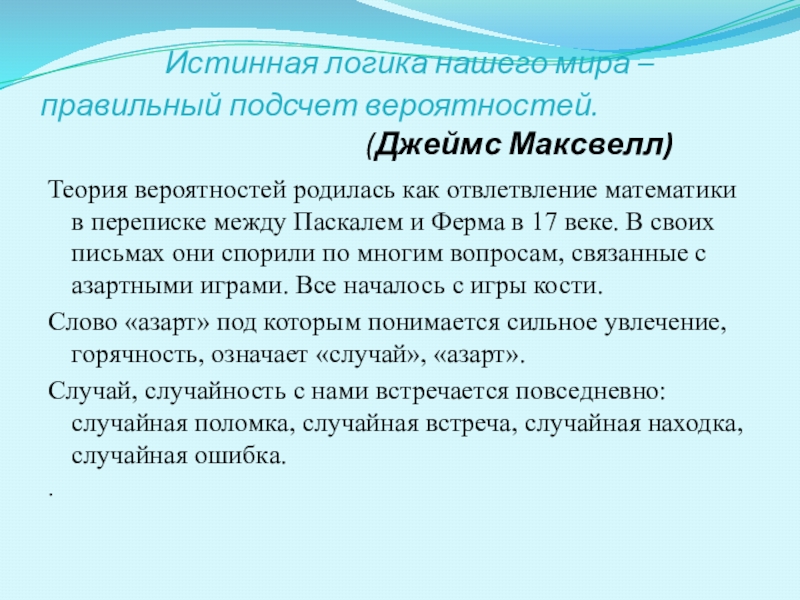 Теория вероятностей родилась как отвлетвление математики в переписке между Паскалем и Ферма в 17 веке. В своих письмах они спорили по многим вопросам, связанные с азартными играми. Все началось с игры кости.