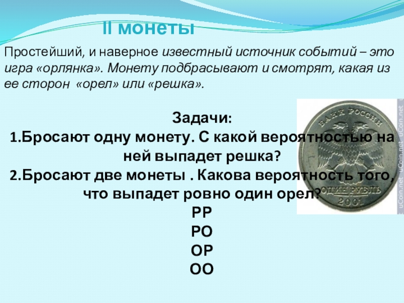 2.Бросают две монеты . Какова вероятность того, что выпадет ровно один орел?