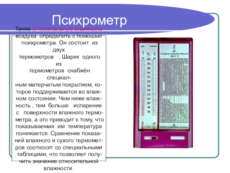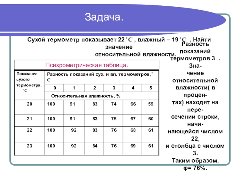Сухой термометр показывает 22 ̊ С , влажный – 19 ̊ С . Найти значение