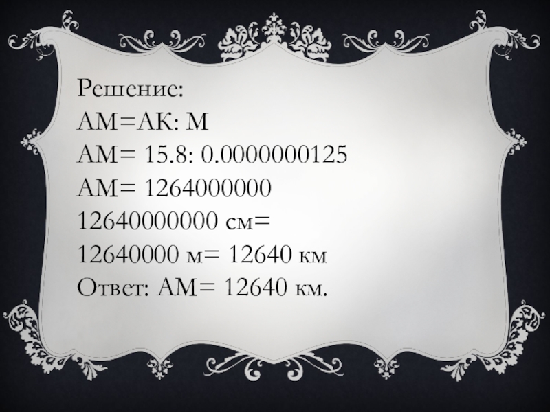 Решение:АМ=АК: МАМ= 15.8: 0.0000000125АМ= 126400000012640000000 см= 12640000 м= 12640 кмОтвет: АМ= 12640 км.