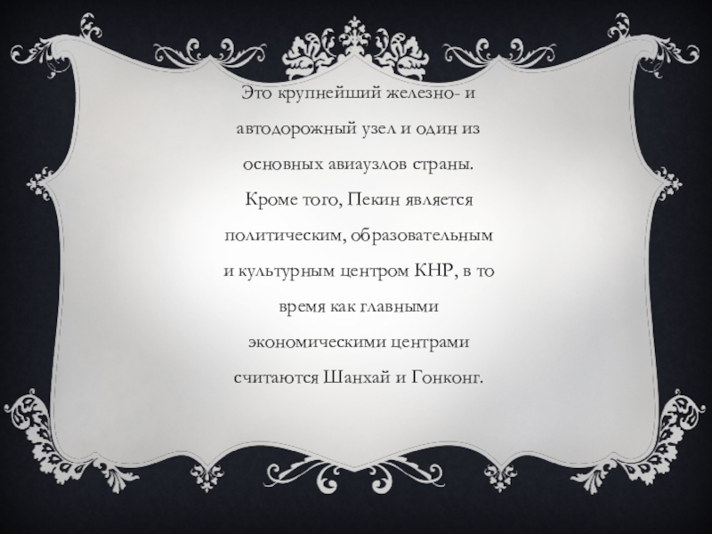 Это крупнейший железно- и автодорожный узел и один из основных авиаузлов страны. Кроме того, Пекин является политическим,