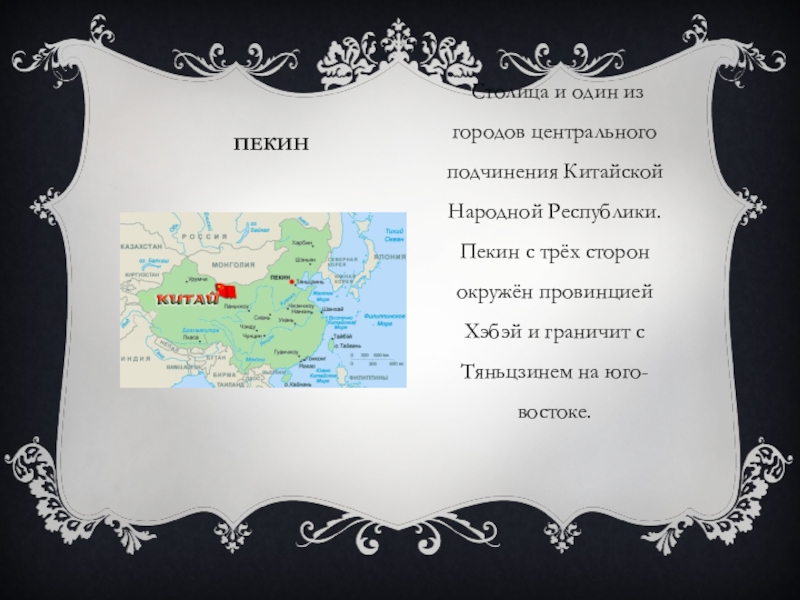 Пекин Столица и один из городов центрального подчинения Китайской Народной Республики. Пекин с трёх сторон окружён провинцией