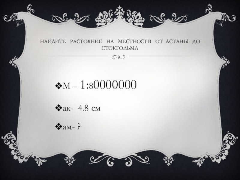 Найдите  растояние  на  местности  от Астаны  до стокгольмаМ – 1:80000000ак- 4.8 смам-