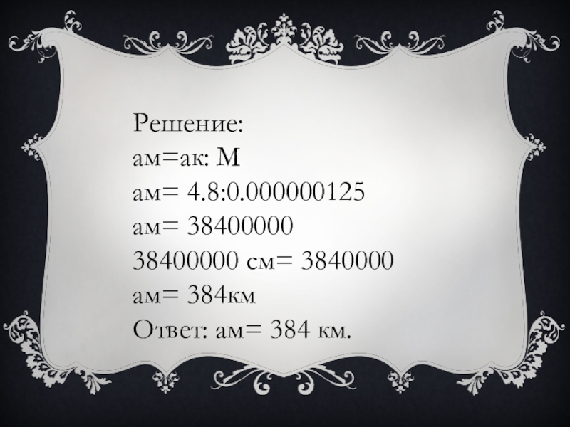 Решение:ам=ак: Мам= 4.8:0.000000125ам= 3840000038400000 см= 3840000 ам= 384кмОтвет: ам= 384 км.
