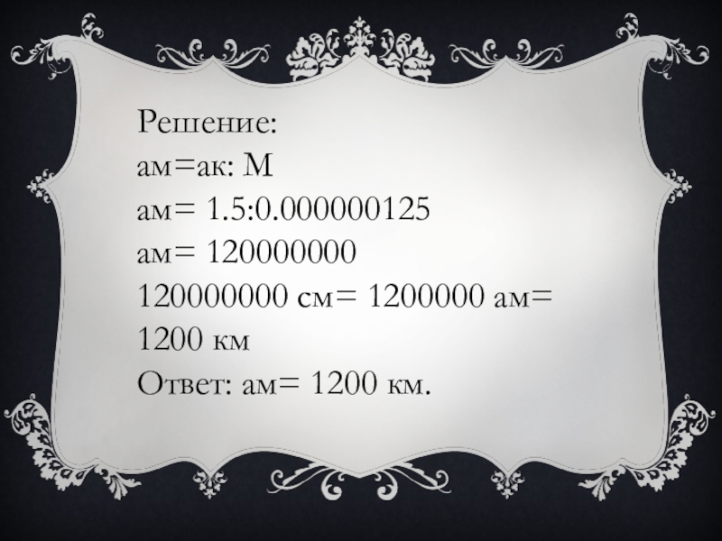 Решение:ам=ак: Мам= 1.5:0.000000125ам= 120000000120000000 см= 1200000 ам= 1200 кмОтвет: ам= 1200 км.