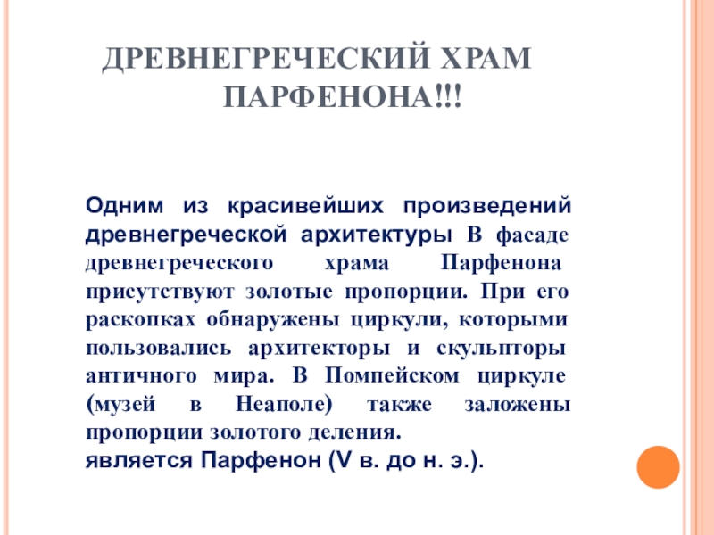 Одним из красивейших произведений древнегреческой архитектуры В фасаде древнегреческого храма Парфенона присутствуют золотые пропорции. При его раскопках обнаружены циркули, которыми пользовались архитекторы и скульпторы античного мира. В Помпейском циркуле (музей в Неаполе) также заложены пропорции золотого деления.