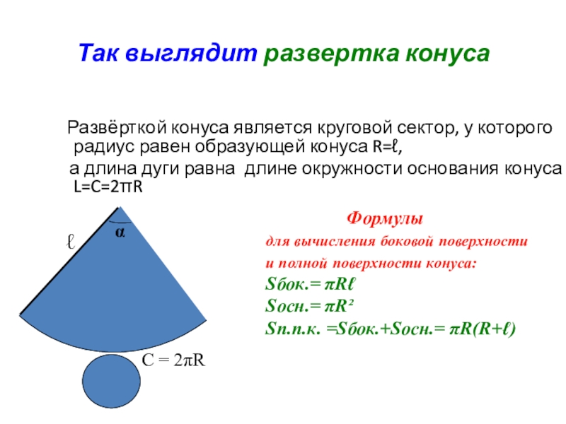 Sп.п.к. =Sбок.+Sосн.= πR(R+ℓ)