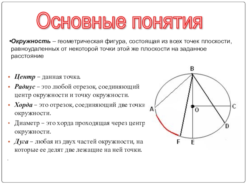 Окружность – геометрическая фигура, состоящая из всех точек плоскости, равноудаленных от некоторой точки этой же плоскости на заданное расстояние